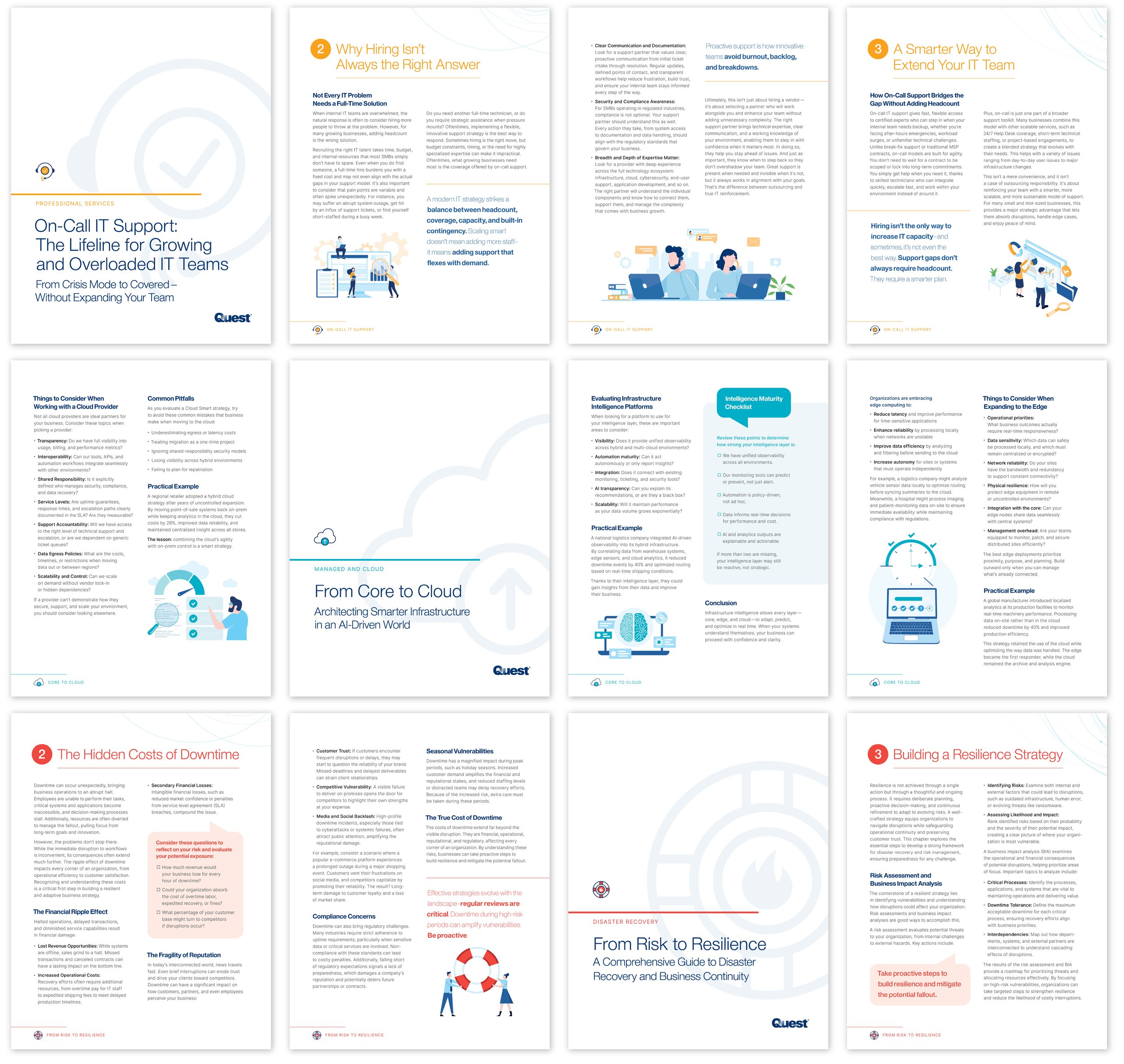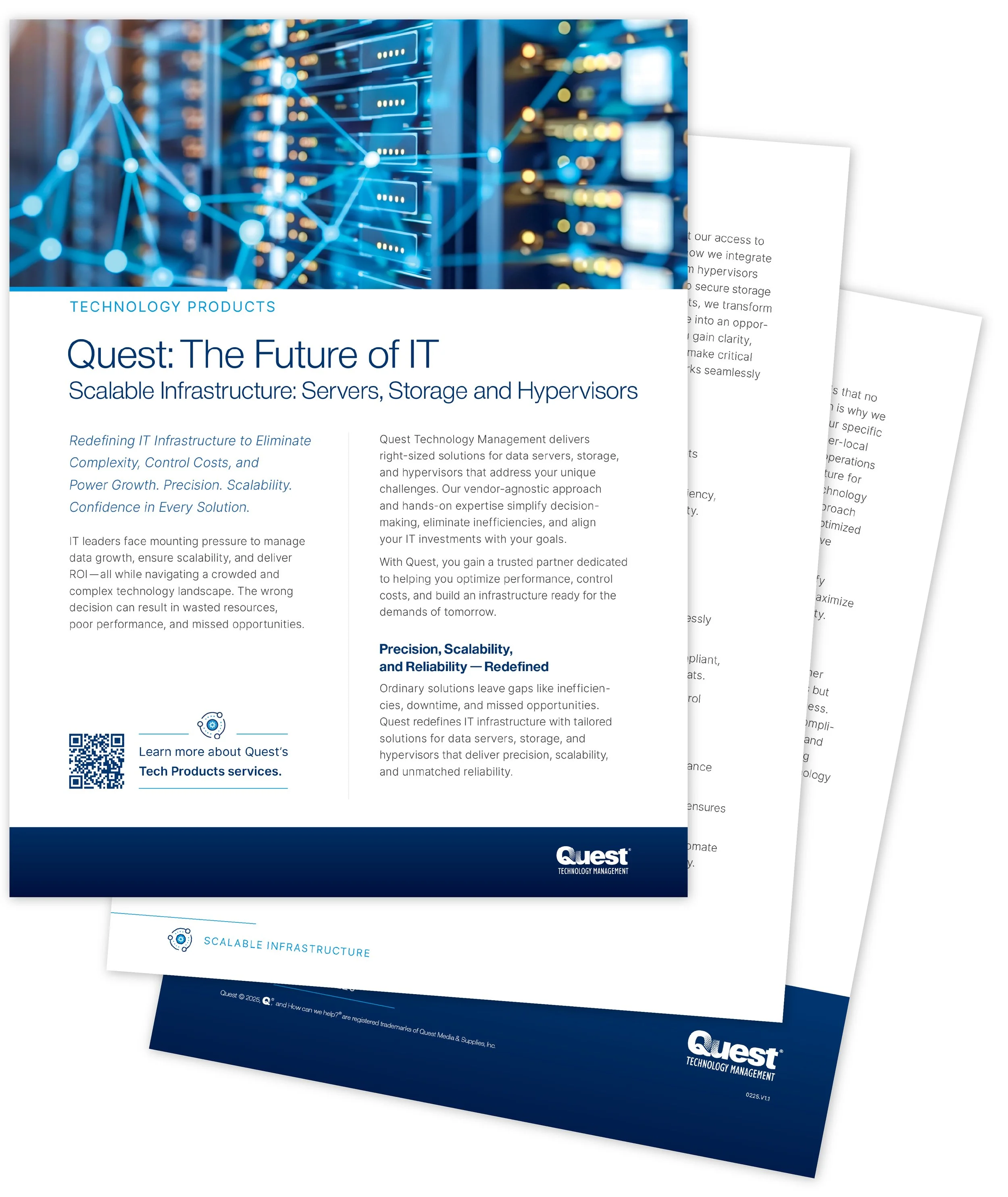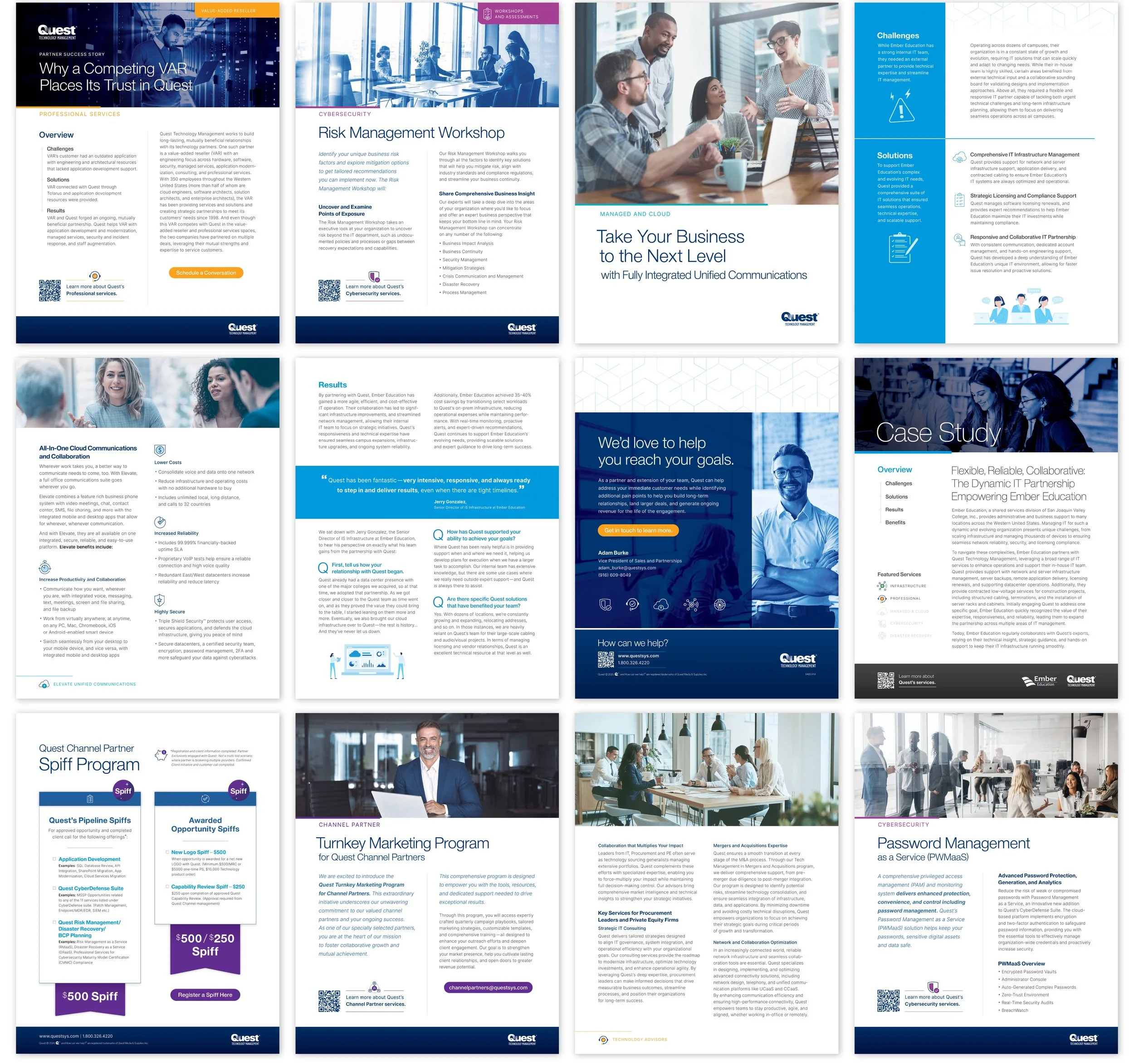 The inclusion of pillar-specific icons and colors guide clients and potential customers through the categorized offerings. Natural and friendlier photography, along with colorized vector illustrations, exemplify Quest’s personalized approach to each customer’s story and unique solutions. Modern type treatments provide improved readability and consistent flow throughout each document.