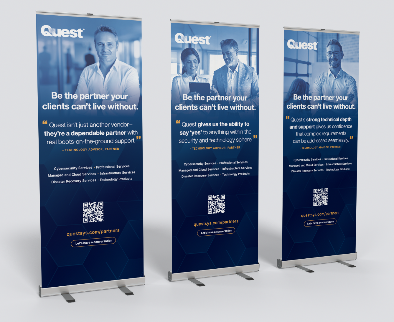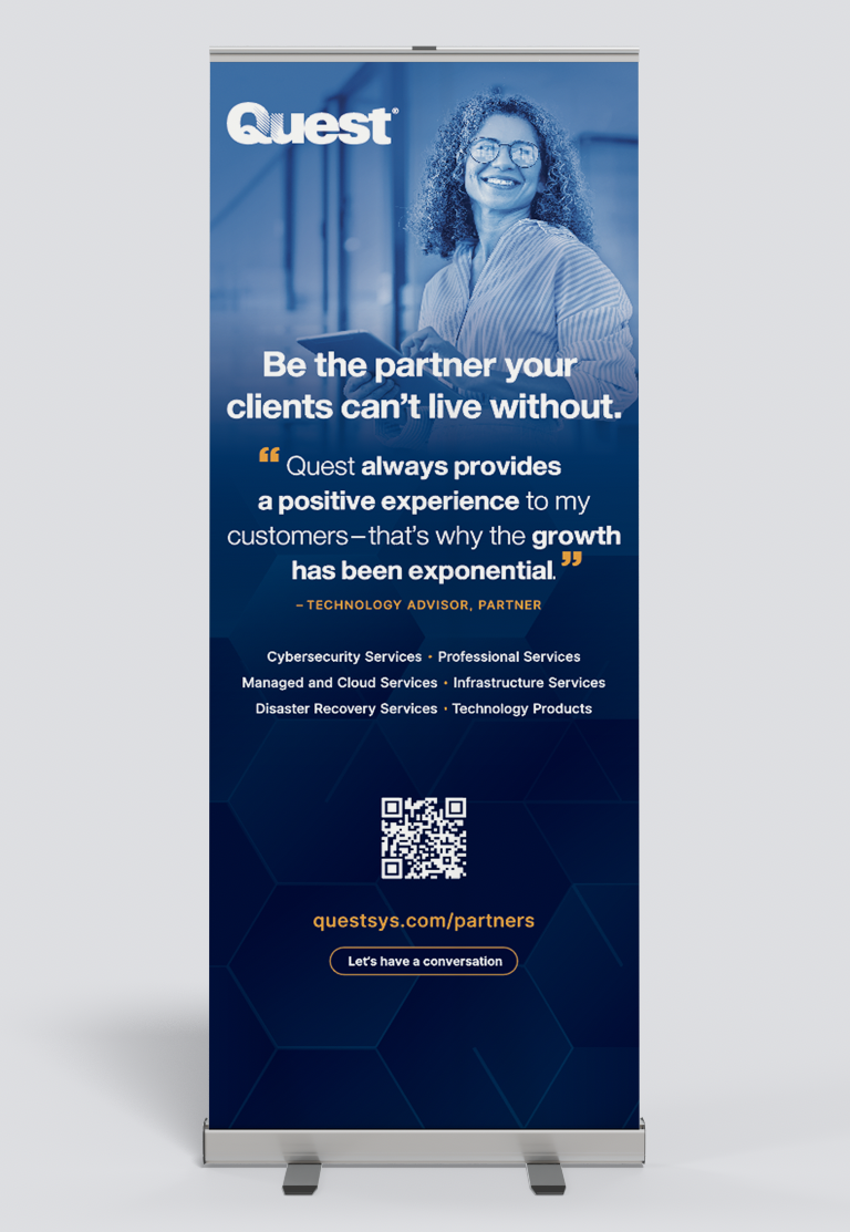 Banners, table covers, and display designs become statement pieces at every event. The repeated hexagon shapes that build into each arrangement symbolize Quest’s fundamental pillars, forming a “building block” foundation. By focusing on their respective audience and experience, Quest is propelled as an educated and reliant source, available to assist with any and all technological needs.