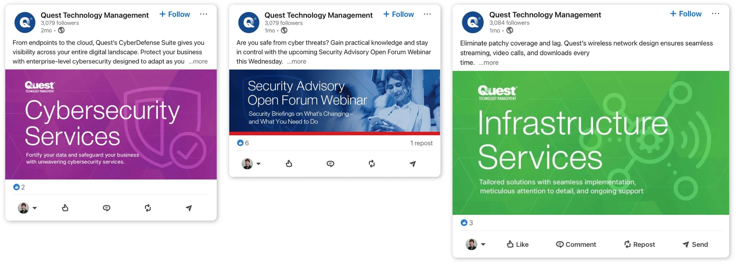 Color gradients and complimenting patterns accentuate the focus on the company’s technology-based services with a sleek finish. Social media assets are simplified and vibrant, allowing Quest’s insight and expertise to speak boldly. Video thumbnails and transition cards affirm Quest’s vast knowledge and presence in the professional sphere.